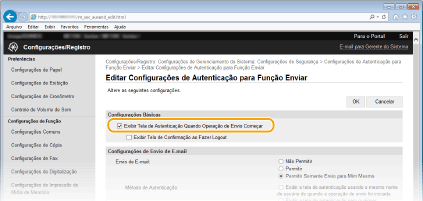 Nenhuma tela de autenticação é exibida quando e-mails ou I-Faxes são enviados. A autorização no servidor SMTP é realizada usando o nome de usuário e senha definidos em [Configurações de E-mail/I-Fax] Configurando as definições de comunicação de e-mail/I-Fax.