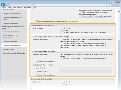 Quando a opção [Permitir Somente Envio para Mim Mesmo ou para Pasta Especificada] está especificada em [Envio de Arquivo]