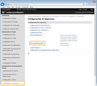 Usando o painel de operaçõesTambém é possível ativar ou desativar a filtragem de endereços MAC no <Menu> da tela <Início>. Filtro de Endereço MAC