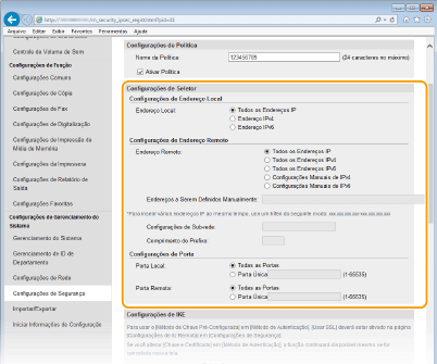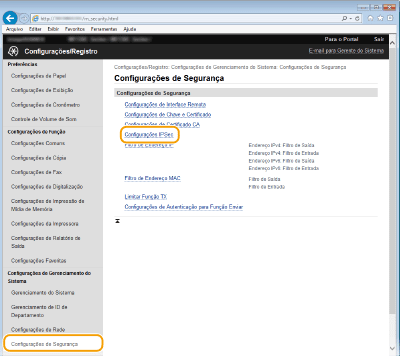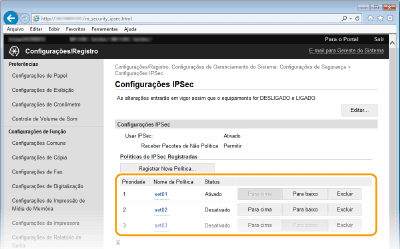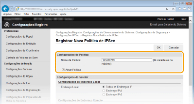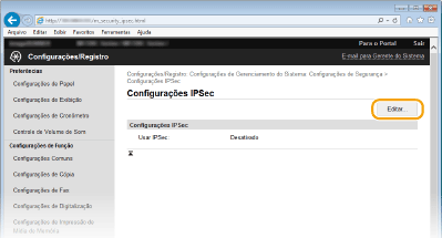 Usando o painel de operaçõesTambém é possível ativar ou desativar a comunicação IPSec no <Menu> da tela <Início>. Usar IPSec