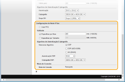 Especifique as configurações [Válido para] e [Autenticação]/[Criptografia]/[Grupo DH].