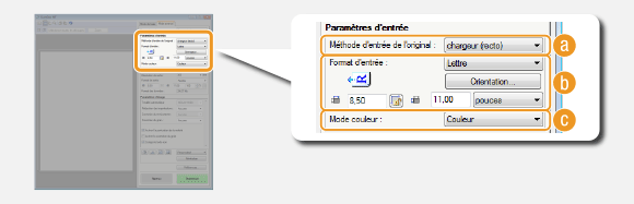 Indiquez le mode d'entrée du document (vitre d'exposition ou chargeur), le format du document, le mode couleur et d'autres paramètres.