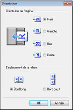 Si des documents sont introduits dans le chargeur, définissez leur orientation dans [Orientation]. Vous pouvez également définir [Emplacement de la reliure] s'il s'agit de documents recto verso.