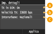 È possibile specificare anche <TX in ECM> e <Velocità TX> da <Menu>  <Impostazioni fax>. Le impostazioni configurate da <Rubrica> sono abilitate per le impostazioni dettagliate delle destinazioni nella Rubrica.