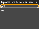 Per salvare i documenti ricevuti in memoria, impostare <Impostazioni blocco in memoria> su <On>. È inoltre possibile specificare impostazioni opzionali come la configurazione della protezione che richiede una password per sbloccare la funzionalità e l'impostazione dell'ora che consente di specificare un periodo del giorno in cui i documenti ricevuti vengono salvati in memoria.