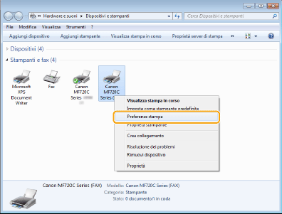 Fare clic con il pulsante destro del mouse sull'icona del driver fax della macchina, quindi fare clic su [Preferenze stampa].