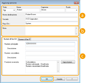 Immettere i numeri di fax. È possibile separare, se necessario, i numeri con trattini. Se si desidera aggiungere spiegazioni degli usi dei numeri di fax, come "Casa" o "Ufficio", immetterle in [Descrizione].