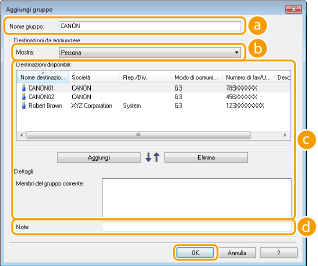 Selezionare le destinazioni da registrare in Selezione gruppo e fare clic su [Aggiungi]. Le destinazioni selezionate vengono visualizzate in [Membri del gruppo corrente].