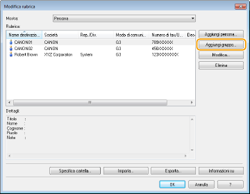 In questa sezione viene descritto come registrare le destinazioni nella Rubrica per i fax da PC. È possibile selezionare singole destinazioni tra quelle registrate nella Rubrica per creare una destinazione di gruppo (Selezione gruppo), utile quando si inviano fax a più destinazioni contemporaneamente.