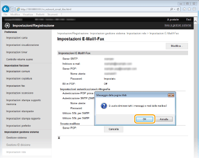 Facendo clic su [OK] nella finestra del messaggio vengono eliminate tutte le e-mail contenute nella casella di posta del server. Se la macchina non ha un account e-mail speciale, è consigliabile prima controllare che nella casella di posta non vi siano e-mail da conservare.