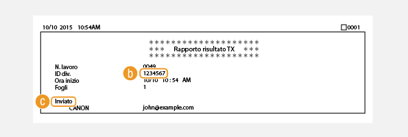 Per le e-mail, i Rapporti risultato TX indicano il risultato della trasmissione tra la macchina e il server di posta, non tra la macchina e l'indirizzo di destinazione. anche se la trasmissione non riesce, non viene stampato alcun codice di errore a tre cifre. Per controllare il codice di errore, stampare un Rapporto gestione comunicazioni (