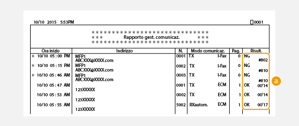 Quando viene visualizzato un codice di errore). Per le e-mail, i Rapporti gestione comunicazioni indicano il risultato di trasmissione tra la macchina e il server di posta, non tra la macchina e l'indirizzo di destinazione.