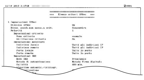 È possibile controllare l'elenco dei nomi dei criteri e le impostazioni IPSec registrate nella macchina stampando un Elenco criteri IPSec.