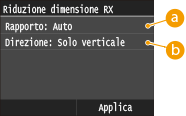 Specificare le impostazioni per ridurre la dimensione immagine di un documento ricevuto. È possibile selezionare un rapporto di riduzione automatico che riduca la dimensione del documento ricevuto in base al formato della carta caricata. È inoltre possibile selezionare un rapporto dall'elenco.