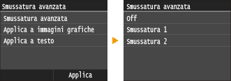 Le impostazioni relative a <Applica a immagini grafiche> e <Applica a testo> sul display diventano effettive solo se in Rifinitura avanzata nel driver della stampante è impostata l'opzione [Impost. predefinite stampante].