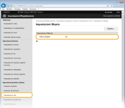 Accedere alla IU remota in modalità Gestore sistema ( Avvio della IU remota)  [Impostazioni/Registrazione]  [Impostazioni rete]  [Impostazioni Mopria]  [Modifica]  Verificare che la casella di controllo [Utilizzo Mopria] sia selezionata  [OK]