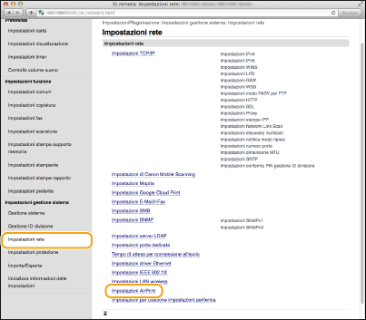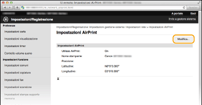 È possibile registrare le informazioni, compresi il nome della macchina e la posizione di installazione, utilizzate per identificarla. È inoltre possibile disabilitare la funzione AirPrint della macchina. Utilizzare la IU remota per modificare tali impostazioni.
