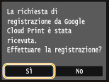 È possibile registrare la macchina anche da un dispositivo mobile o da Google Chrome. Il display della macchina visualizza la seguente schermata di conferma prima di completare la registrazione. Scegliere <Sì> per completare la registrazione.