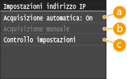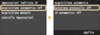 ![]() Se viene visualizzato <On>, toccare <Acquisizione automatica> e impostare sia <Selezione protocollo> e sia <IP automatico> su <Off>.