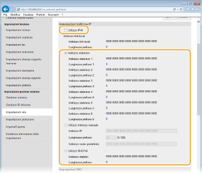 Gli indirizzi IPv6 della macchina possono essere configurati attraverso la IU remota. Prima di impostare indirizzi IPv6, verificare le impostazioni dell'indirizzo IPv4 (Visualizzazione delle impostazioni IPv4). È necessario impostare correttamente i parametri IPv4 per utilizzare gli indirizzi IPv6. Tenere presente che la funzione di scansione che utilizza il driver dello scanner o MF Scan Utility non è disponibile in ambiente IPv6. La macchina può utilizzare fino a nove dei seguenti indirizzi IPv6: