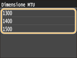 Nella maggior parte delle reti Ethernet, la dimensione massima del pacchetto che può essere inviato è di 1.500 byte. Un pacchetto è riferito a un blocco di dati in cui i dati originali vengono divisi prima di essere inviati. L'unità massima di trasmissione (MTU, Maximum Transmission Unit) può variare a seconda della rete. Modificare le impostazioni della macchina in base alle esigenze. Per ulteriori informazioni contattare l'amministratore di rete.