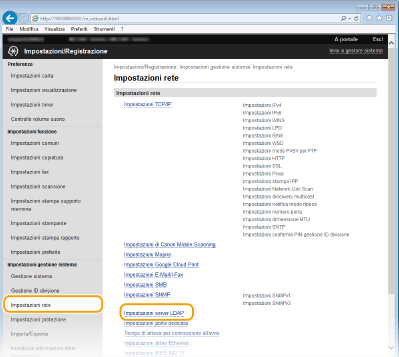 Se un server LDAP viene implementato nella rete, è possibile cercare sul server numeri di fax e indirizzi e-mail e specificarli come destinazioni o registrarli nella Rubrica. Si noti anche che se è abilitata l'autenticazione della funzione di invio ( Autenticazione del server LDAP ), è necessario registrare il server utilizzato per l'autenticazione. È possibile registrare sulla macchina un massimo di cinque server LDAP, ognuno per la ricerca e l'autenticazione. Registrare i server LDAP attraverso la IU remota.