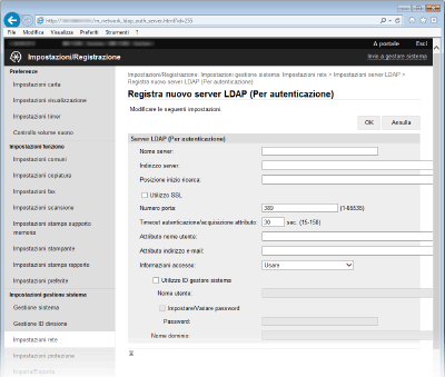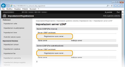 Fare clic su [Registrazione nuovo server] per [Server LDAP (Per ricerca)] o [Server LDAP (Per autenticazione)].