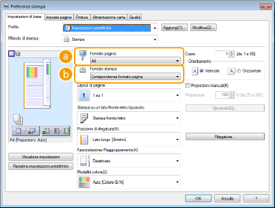 Selezionare il formato della carta su cui il documento verrà effettivamente stampato. Se il formato selezionato è diverso da quello specificato in [Formato pagina], il documento viene stampato automaticamente con dimensioni ingrandite/ridotte in base al formato selezionato. Ingrandimento o riduzione