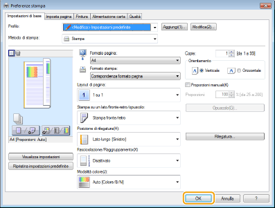 È possibile specificare con semplicità il layout di pagina, la posizione della rilegatura e così via agendo in maniera del tutto intuitiva nell'immagine di anteprima. Per ulteriori informazioni, fare clic su [?] nella schermata del driver stampante.
