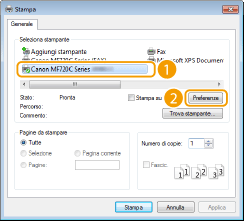 Selezionare il driver stampante della macchina e fare clic su [Preferenze] o [Proprietà].