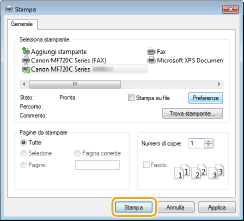 La modalità di visualizzazione della finestra di dialogo di stampa varia in base alle diverse applicazioni. Per ulteriori informazioni, consultare il manuale di istruzioni dell'applicazione in uso.
