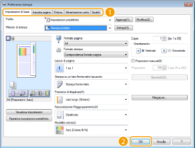 Fare clic sulle schede [Impostazioni di base], [Imposta pagina], [Finitura], [Alimentazione carta] o [Qualità] per specificare le impostazioni di stampa per ogni schermata, in base alle esigenze.