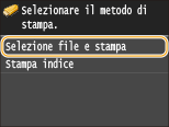 È possibile stampare miniature dei file di immagine (solo JPEG) salvati in un dispositivo di memoria USB. Per stampare le immagini in miniatura, selezionare <Stampa indice> nella schermata e procedere al passo successivo.