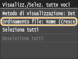 È possibile specificare un'impostazione di ordinamento, ad esempio <Nome (Crescente)> o <Data/Ora (Crescente)> come impostazione predefinita per l'ordinamento dei file.