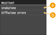 È possibile selezionare il metodo di stampa per riprodurre mezzitoni (la gamma intermedia tra le aree più chiare e scure di un'immagine) per ottenere la qualità ottimale del'immagine. Toccare <Gradazione> o <Diffusione errore>.
