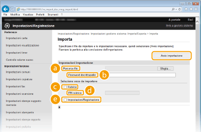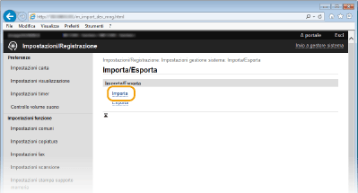 Caricare i dati (importazione) che sono stati esportati dalla macchina. Se i modelli sono gli stessi, è anche possibile importare le impostazioni provenienti da un'altra macchina.