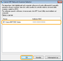 Accertarsi che la macchina e il computer siano connessi e che tutto il software sia installato. Per eseguire la connessione tramite LAN wireless o cablata è necessario registrare la macchina in MF Network Scanner Selector. Eseguire la registrazione seguendo la procedura descritta. Questa procedura non è necessaria se la macchina e il computer sono collegati tramite USB.