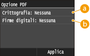 Se si seleziona <Impostazione dettagli PDF>, è possibile specificare le opzioni PDF relative a crittografia e firma digitale per <PDF (Compresso)>, <PDF>, <PDF (Compresso/OCR)> o <PDF (OCR)>.