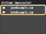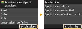 È possibile selezionare una destinazione tra le tre più utilizzate in precedenza. Quando si specifica una destinazione utilizzata in precedenza, la macchina configura, per praticità, le stesse impostazioni di scansione, ad esempio per la densità, utilizzate per l'ultimo invio di documenti a tale destinazione.
