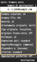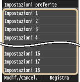 Per modificare o eliminare impostazioni registrate, passare a <Scansione>  <Impostazioni preferite>  <Modif./Cancel.>  <Modifica> o <Cancella> e quindi attenersi alle istruzioni seguenti. Per modificare un'impostazione: