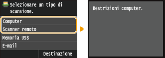 ![]() Se è selezionata la casella di controllo [Scansione], vengono applicate restrizioni a tutte le funzioni Salva su dispositivo di memoria USB, Invia e-mail e Salva in cartella condivisa o server FTP. È possibile applicare restrizioni anche ad altri metodi di scansione documenti importandoli in un computer, ma in quel caso non è possibile bloccare l'accesso per ciascun ID reparto (Blocco di lavori quando l'ID reparto è sconosciuto).
