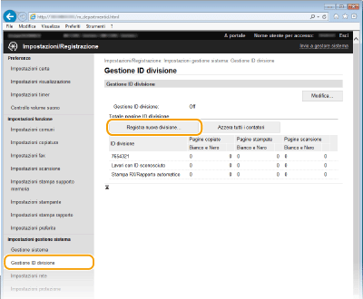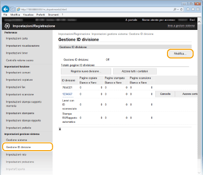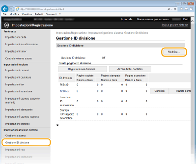 [Totale pagine ID divisione]È possibile verificare il numero totale delle pagine copiate, stampate, digitalizzate o inviate via fax per ciascun ID reparto.