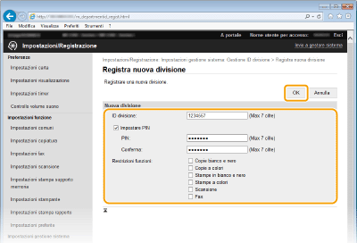 Per impostare un PIN, selezionare la casella di controllo e immettere un numero fino a sette cifre nelle caselle di controllo [PIN] e [Conferma].