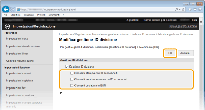 Selezionare la casella di controllo [Utilizza Gestione ID reparto] e fare clic su [Impostazioni] a destra di essa.