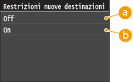 Limitando i numeri di fax che è possibile specificare quando si inviano documenti a quelli già registrati nella Rubrica, a quelli già usati o a quelli che i server LDAP possono cercare, è possibile ridurre la probabilità di specificare destinazioni errate ed evitare agli utenti perdite di informazioni. Quando questa funzione è abilitata, la macchina impedisce agli utenti l'immissione di destinazioni utilizzando i tasti numerici, l'aggiunta di nuovi dati alla Rubrica e la modifica dei dati esistenti nella Rubrica.