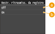 Impedisce di specificare destinazioni dai record di trasmissione. L'uso di questa restrizione impedisce la selezione di destinazioni dai record di trasmissione per "Invia fax", "Esegui scansione e invia via e-mail" e "Esegui scansione e salva in cartella condivisa o server FTP".