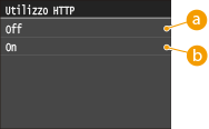 HTTP è utilizzato per le comunicazioni in rete, ad esempio quando si accede alla macchina tramite IU remota. Se si utilizza una connessione USB o, comunque, non si utilizza HTTP, è possibile disabilitare HTTP per impedire intrusioni di terzi indesiderati tramite la porta HTTP non utilizzata.
