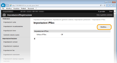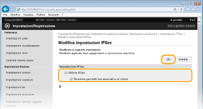 Utilizzo del pannello operativoÈ possibile abilitare o disabilitare la comunicazione IPSec da <Menu> nella schermata <Schermata principale>. Utilizzo IPSec