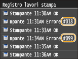 Se la stampa non riesce o non è possibile inviare o ricevere fax o documenti acquisiti oppure si verifica un altro errore, tale errore viene segnalato su un rapporto o con un messaggio sulla schermata <Monitoraggio stato> come numero di tre cifre (codice di errore). Verificare quanto segue per individuare cause e soluzioni per ciascun codice di errore. Per istruzioni su come stampare un rapporto di errore e sulle informazioni contenute nel rapporto, vedere