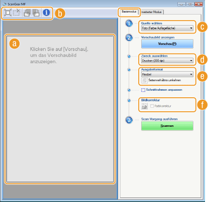 auf dem Bildschirm angegeben ist, und klicken Sie auf [Scannen]. So können Sie die grundlegenden Einstellungen konfigurieren und dann scannen.